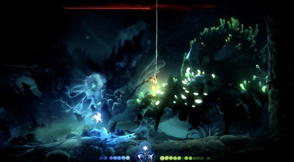 Additionally, Will of the Wisps‘s ability progression looks much more similar to Hollow Knight‘s, following the model of separate unlockable abilities (in this game called Spirit Shards) that can be equipped into a limited number of slots, very similar to Hollow Knight‘s Charm system. In my previous discussion, I noted that this progression system allowed for more interesting and varied pickups, as opposed to collecting generic Ability Points pickup that take out the surprise of picking up new abilities. This works fine in a game as short as Blind Forest, but with Will of the Wisps being longer, this change to be more similar to a charm system is welcome for its variety.