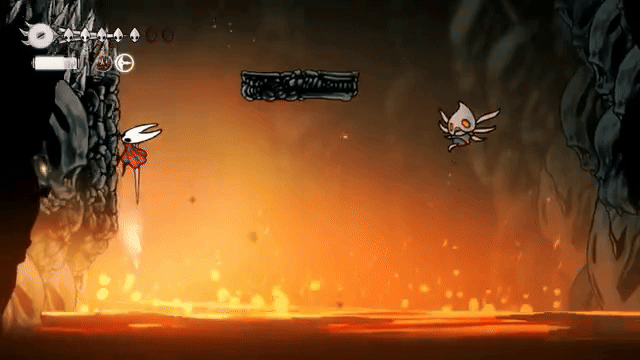 Inspiration from Ori and the Blind Forest can also be observed within Silksong. Most notably, there are two sequences within Silksong that are completely the same style as many of the large challenges within Blind Forest. The sequence boils down to escaping out of a pit while liquid slowly rises, threatening to destroy the player if they fall into it. Multiple of these sequences exist within Blind Forest, and Silksong seems to inspire this style of level, once in an optional area within the Far Fields area, where lava rises up in the Skull Cave after defeating a small gauntlet of enemies. The other is near the beginning of Act 3, where lava rises up as the player attempts to escape the Abyss, teaching them how to use their newly-unlocked Silk Soar ability. Having played both games, I was incredibly excited to see this style of level in Silksong, because I enjoyed them so much in Ori.