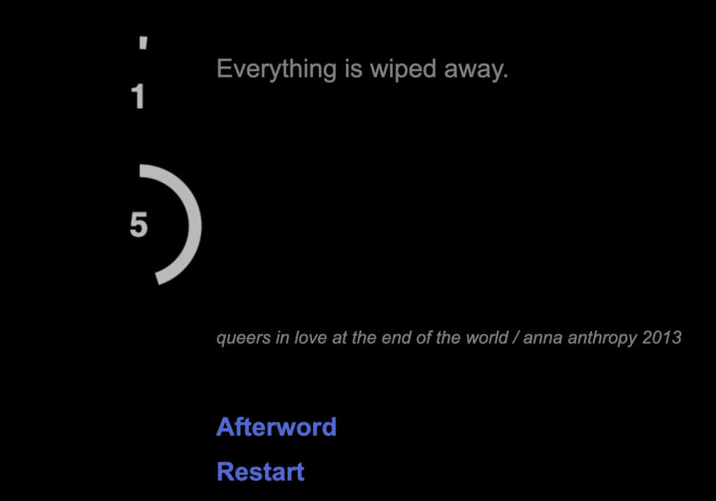 The game is fundamentally queer not only in its subjects but in its form; it resists any win condition, narrative closure, or sense of mastery or power. The timer complicates expectations of the interactive fiction genre by resisting a leisurely pace. It keeps the player on edge and hyperaware, reflecting the precarity of many queer relationships. The player is left helpless as the world ends and is forced to “fail,” which is incongruous with a neoliberal culture obsessed with optimization, self-improvement, and success.