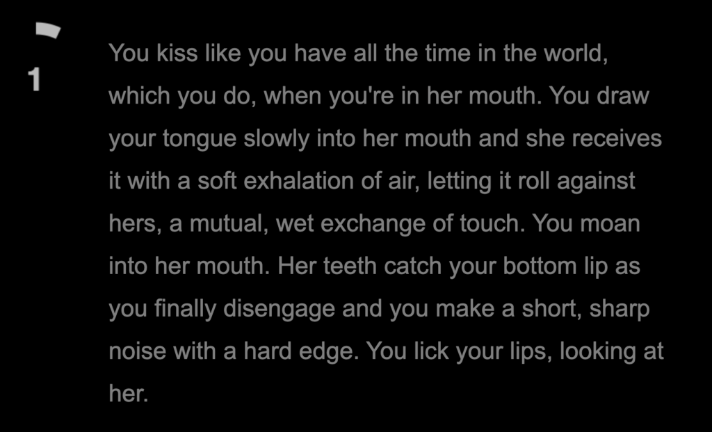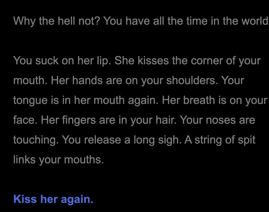 The “Kiss” to “Slowly” path is actively working against any attempt at “speed running.” The text after slowly is the longest out of all the paths I did, and you have to scroll down to see the blue hyperlink “kiss her again,” which takes up precious time.