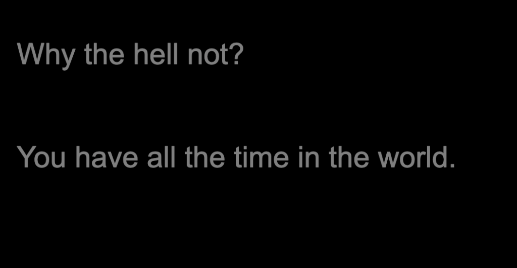 The final frame of this path repeats, “Why the hell not? You have all the time in the world.”