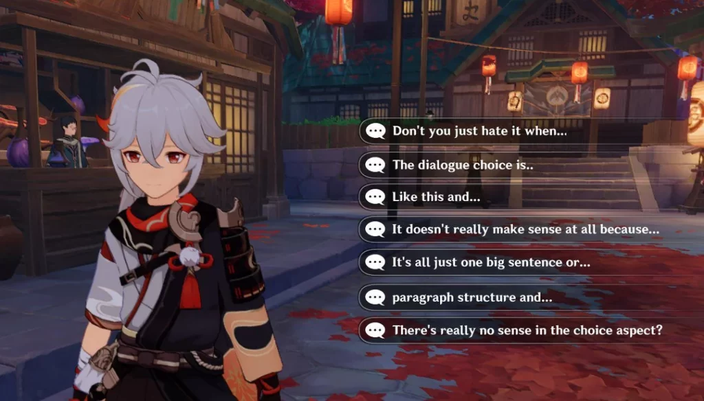 While Genshin Impact may be categorized as a role-playing game, I believe that the player’s role in the game falls under the category of “acting” rather than “role-playing”, considering the definitions outlined in Peter McDonald’s essay Act Natural. Genshin Impact’s story follows a pre-determined script, and your character, the Traveler, merely follows along. The Traveler is not an active character; instead, they seem to happen upon the events of each region by chance, and get swept up into the story rather than making calculated plot decisions to influence the narrative. Furthermore, within the very limited opportunities for dialogue options, your choices are either one or two short sentences that basically say the same thing, and choosing one or the other has no effect on how the story plays out or your relationships with the characters. Rather than having the game be a space for exploration of different possibilities within the story and situations you find yourself in, the story is a rigid script that you have no freedom to deviate from.
