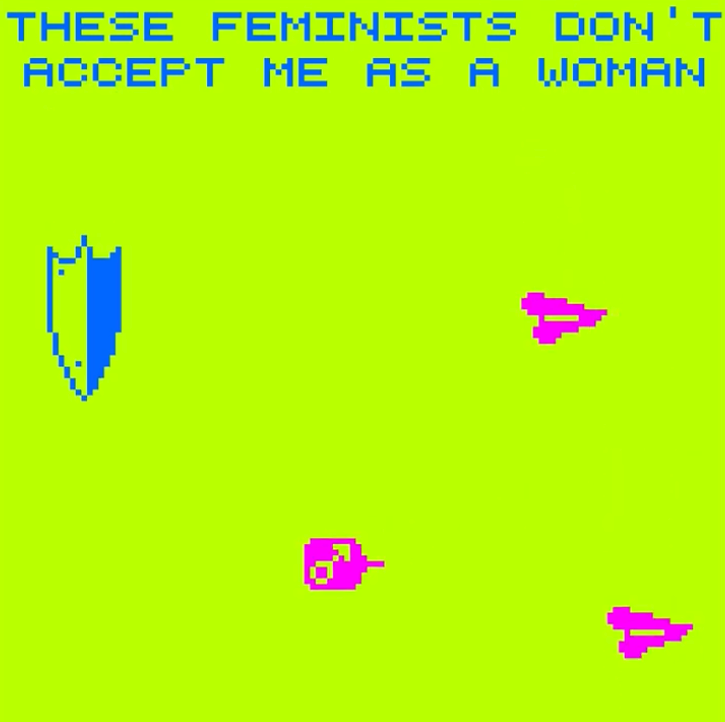 The hypervisibility and forced invisibility show the frustration experienced by Anna Anthropy, which creates the stage for her story. This can be prominently seen in many sections throughout Level 1. Take for example the section where certain feminists don’t accept the avatar as a woman. Towards the end of the minigame, quotations are added around the word feminists to express the tiring toll of hypervisibility.