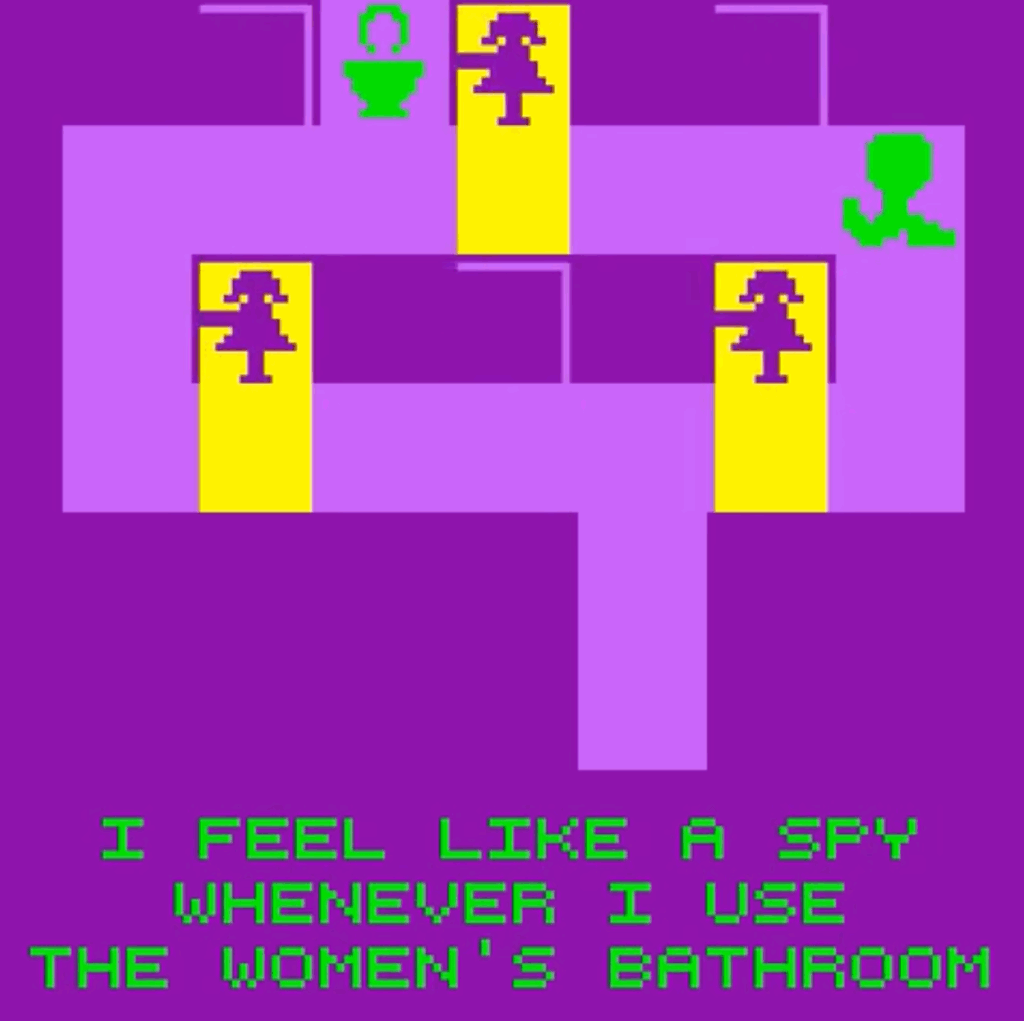 Thanks for sharing this—I really appreciate the detail you go into, especially with the section on women’s bathrooms! I wanted to add that another element to consider about ‘hypervisibility’ here is the design of the protagonist’s sprite. Here, she becomes akin to an alien or some kind of octopus-esque creature. Additionally, the color scheme used is very discordant; purple and green are on the opposite sides of the color spectrum. This seems like a literal painting of the deeper notion that runs through the entire game—that the protagonist is separated from the rest of female society, that the rest of society views her as ‘different’ and ‘alien’. Another thing that struck me about the game is that it constantly changes activity without waiting for the player to be ready. This almost paints the author’s experience in that they feel a lack of autonomy over what happens next.