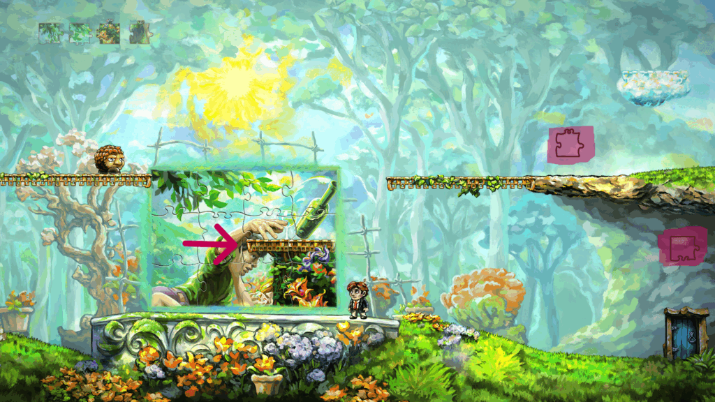 There is one puzzle in particular that caused this sentiment to well up in me. At the end of the second level of the game, The Cloud Bridge, you encounter the above puzzle. There are two puzzle pieces (the empty outlines are highlighted in pink) that are inaccesible to the player. By the point that you encounter it, the puzzle to the left of Tim maybe has two or three puzzle pieces from the first two levels, not the whole puzzle. Notably, he does not have either of the two puzzle pieces with a platform on them (as indicated by the pink arrow) because they are collected in subsequent levels of World 2. The trick to solving this puzzle by aligning the platform of a puzzle piece with the platform that the enemy is walking on, on the left. Then you slowly move that platform down (carefully as not to dislodge the enemy) by entering the puzzle screen (which is totally separate from the main level, so you cannot see the enemy’s position), until the enemy is positioned such that Tim can jump onto it and bounce onto the platform on the right. And the bottom puzzle piece is reached by dislodging the enemy when it is facing right, but not left, and then jumping on the enemy to reach the piece.