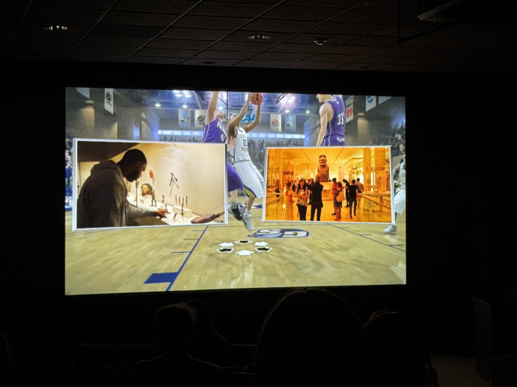 This, combined with the 3D renderings of cultural artifacts and vlog-style exploration of both museums, added a much more personal dimension to the sports footage, which I think was very necessary considering the injustice of the subject matter. Whereas traditional videogames where we play as fictional characters allow us to create a distance between ourselves and the individuals we embody due to the fact that they aren’t real, hearing the Sandy’s anecdotes makes his peers, whose appearances were appropriated for the game, humanizes them in a way that doing so for NCAA basketball “characters” in It’s in the Game would feel morally wrong. As such, I think Sondra’s use of different audiovisual elements in addition to clips of game footage itself amplified her overarching message, which gave it a more lasting impact to me.