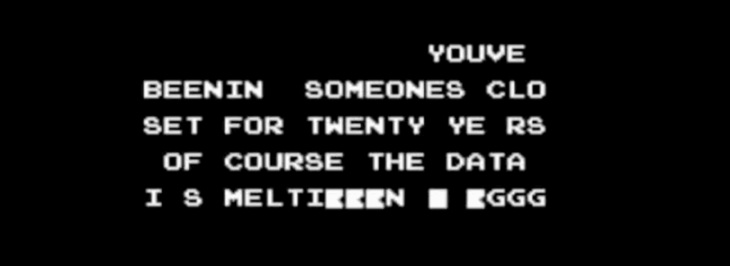To cut a long tangent slightly shorter, Super Mario Movie is exactly the kind of thing that would scare me as a 3rd grader. It isn’t necessarily a horror film, but its looping music, flashing imagery, and black dialogue screens are reminiscent of the analogue horror genera (although I was exposed to that much later, as a 5th grader). More importantly, though, it is reminiscent of old-school creepypastas and Don’t Hug Me I’m Scared videos.