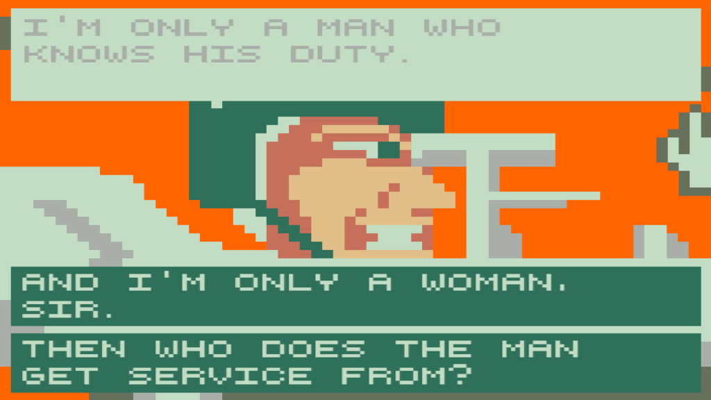 The part of RFFPS where the player has the most agency over their own actions is during the dialogue choice part. After using all their ammo, the player has to speak to the major, where they are given two dialogue options that involve either flattering the Major or belittling the player character. This was the part of the game that frustrated me the most while I played. Often I didn’t want to pick either option, but I had to in order to progress the game, and I think the lack of any player character art only intensified my feelings. If there was some character I could visualize that was saying things like ‘and I’m only a woman sir’ or ‘I need a big, strong man to do it for me’, it would have been easier to play through because some other person is saying those things. But there’s no other person, it’s just me. I am discrediting myself and glorifying this man who doesn’t seem to respect me just to refill my ammo that I can’t properly shoot. What’s the point.