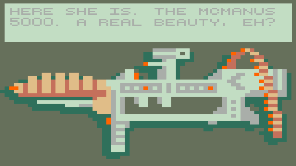 The game art of RFFPS is pixelated and simple. The background of the shooting section of the game is orange and white, and since the enemies are green and black they stand out which makes it even more frustrating, at least for me, when you still can’t hit them. However there is also intrigue where there is a lack of game art, specifically the lack of any relating to the player character. For a lot of FPS even though the player doesn’t see their character for most of the gameplay, they still are playing as a character with its own design, but there are no visible characteristics from the player character at all. The most we get from her in the way of character attributes are the grunts she makes as she sprints and lifts her gun. I think this is deliberate as it forces the player to exist in the world of RFFPS without the cushion of a fictional character, making it more personal, especially when it comes to the dialogue options.