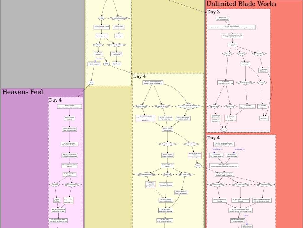 Inevitably, the player will reach a “bad end”, and in order to understand how they got there, they will have to randomly guess as to what dialogue choice led them there. The above image is a guide for one of the most famous visual novels, Fate Stay/Night, and its many routes and choices. Say you wanted to go through the Unlimited Blade Works route, but accidentally end up dead on day 3 or end up on the Fate route. How did you end up there? Well, you will simply have to backtrack your choices on the chart. What if you don’t have a guide? Good luck! Hope you enjoy reloading saves and randomly selecting dialogue options in the hopes of finding the correct route ๐Ÿ™‚