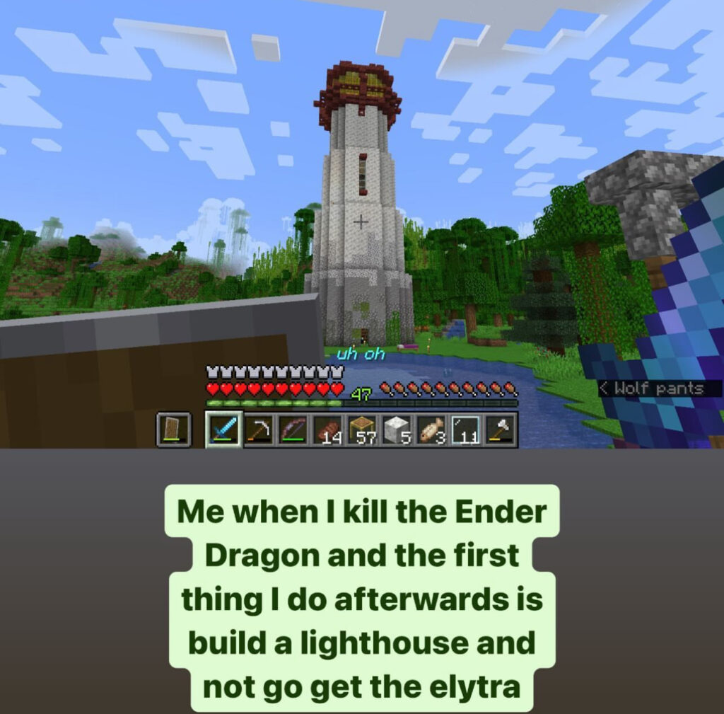 While I have yet to turn my mining urges into a career, I have experienced playbor as procrastination of other playbor within my Minecraft world. Instead of completing my own set goal of killing the Ender Dragon, I decided to chop down a bunch of trees and build a dock instead. Then, after successfully killing the Ender Dragon because I wanted the advancement, I, instead of going to grab the elytra so I could have an easier time accomplishing the rest of my building plans, decided to spend 3 days building a lighthouse complete with a working redstone light inside of it. Arguably, the elytra was the easier option and would have made building that lighthouse so much quicker, but I chose to do more labor by mining stone and calcite because that was what I had deemed more fun.