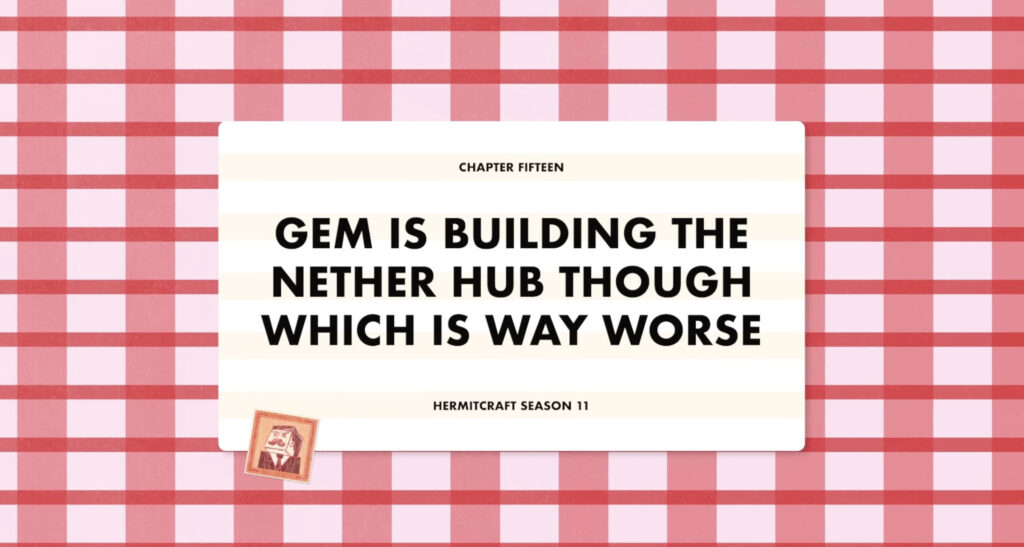 In the image above, Grian walks into ImpulseSV’s base on day three of the server (not Episode 3, DAY 3), where he encounters a full Villager Trading Hall (another incredibly obvious example of playbor in the Minecraft gamespace), not to mention the giant hole Impulse has dug outside. Reasonably, Grian exclaims “Oh, come ON! No way! This is not a normal amount of work to do in a couple of days!” and he is right, but this goes back to the notion of playbor from before. Impulse, for no reason other than his own enjoyment of the game, put in over two days of work in a three day timespan so he could progress further in whatever his plans are for the new season. The use of the word “work” by Grian raises another interesting point surrounding the division between labor and work in the gamespace. Most games have some aspect of player labor in their game mechanics, but every single Hermit plays Minecraft because it is their job. They have, in the most literal sense, gamified the idea of real life labor by playing a game all about labor as play.