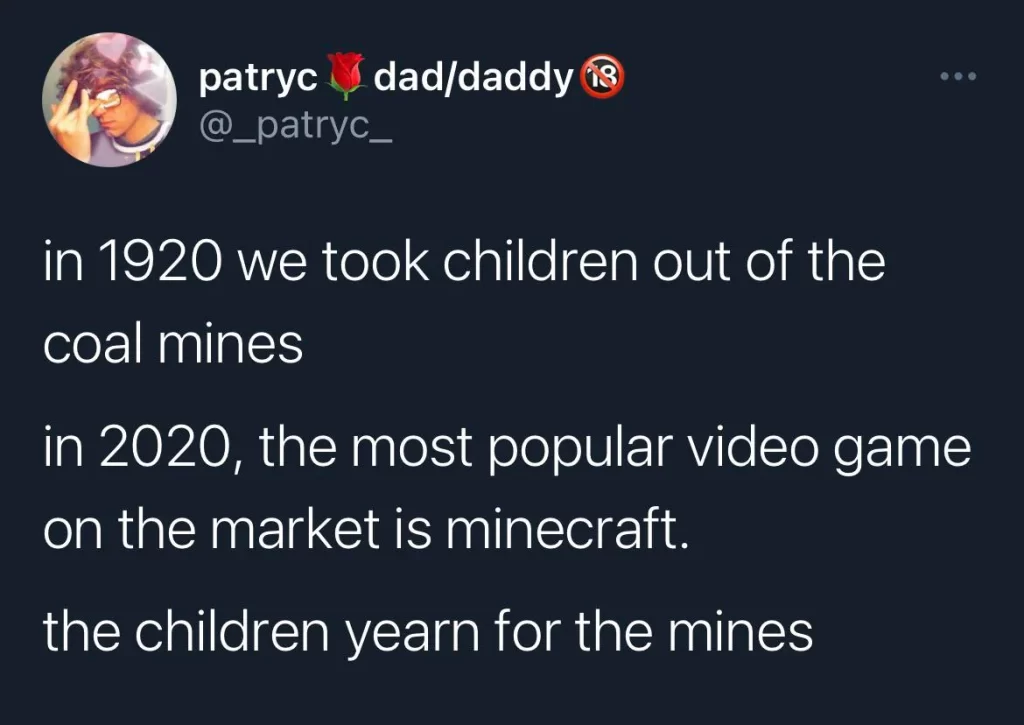 Another Minecraft post from Wren, fork found in kitchen, yeah yeah whatever. It is hardly a secret how I feel about this game, but it is also not a secret how an entire generation has been shaped by this game as well, even if the rest of them are… a lot more normal about it than I am, to say the least. Minecraft is the best-selling game of all time and has been that way since 2019, which has sparked a well-known meme surrounding child labor laws in mining facilities and kids just aching to get a pickaxe back in their hands. Due to this, Minecraft perfectly exemplifies just what it means to be a game of playbor, and how it has affected millions of people, not just children, and how they choose to experience fun in the gamespace.