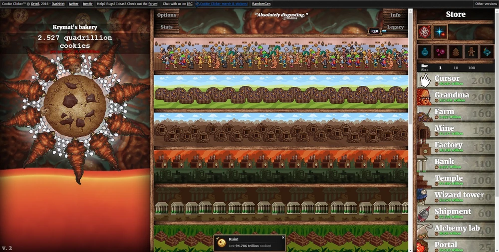 Screenshot from Cookie Clicker – Grandmapocalypse (Orteil, 2013).