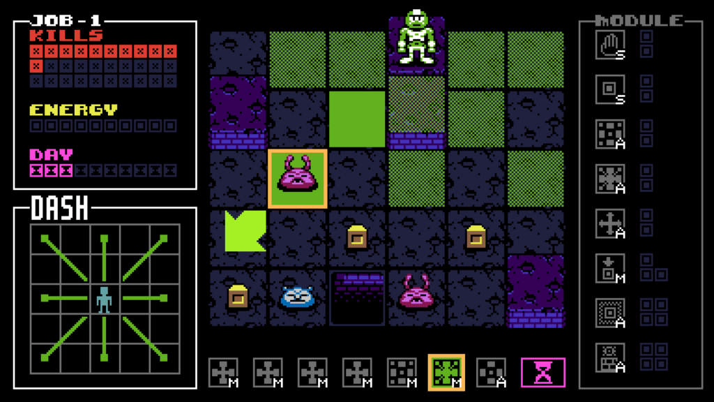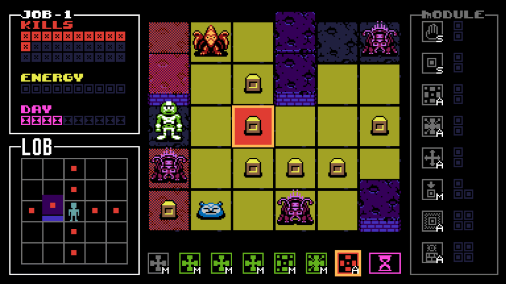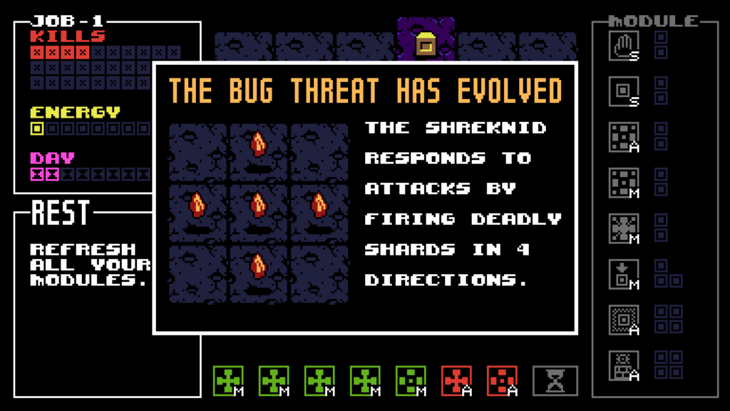 So, after listing all these methods of killing bugs, why is this game difficult? Because you are giving a starting hand with two attacks, the rest of your actions are movement-based. There is a shop available where energy is the currency, but sometimes it is more ideal to use energy to kill monsters rather than to buy more actions. Additionally, the bugs you do not kill by the end of a round evolve in the next round, and how they evolve is random. If the blue bug evolves and you have no jump abilities to get on top of elevated tiles, good luck, because you won’t be able to reach it. Let’s say you do climb an elevated tile; well, good luck with your attacks since they might not line up with the bug. And just like that, because of one bug and its evolution, you lose. Moreover, you have to get 30 kills within 10 “days,” failing to do so is a game over as well. Not only are the bugs a threat, but so is time and energy. You see how this game is difficult? You are given so many tools, but you are also thrown into a game of chance. Despite the randomness, this game had me hooked for hours. It is casual but not easy to master. (Can you even master a game so dependent on luck and randomness?)