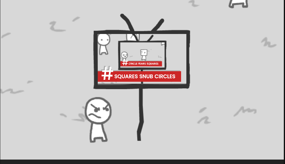 The game’s message on how affected we are by what we consume online is quite clear, but I was also thinking of this game in terms of truth, and how it’s determined. One of the first few instances where the squares and circles begin to divide is when the player takes a photo of a square ‘hmphing’ and turning away from a circle, which results in the caption “#SQUARES SNUB CIRCLES”. For one, that caption lacks the pre-existing context of what led to the photographed encounter and instead of just referring to one square, it’s in regards to all squares. That’s not true and the previous caption said ‘circle’, and yet this one says ‘squares’. It’s a really small detail, but it’s very misleading as it implicates every single square in this world of snubbing all the circles. There’s such blind trust in the small snapshots and short captions displayed on the TV to the point that it affects their physical world so much.